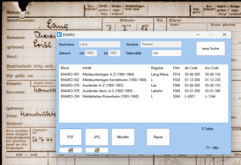 Für diese digitalisierte Version alter Melderegisterkarteien wurden die unterschiedlich codierten „Blips“ (Randeinbelichtungen) mit ausgelesen. So sind die Dateien mit einem eigens programmierten Datenbanksystem sortier- und auffindbar.